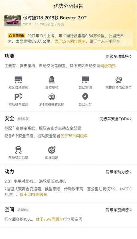 保时捷718 最低售价:57.00万起 最高降价:8.00万 图片 参数配置 询底价 懂车分4.03 懂车实测空间·性能等 车友圈16万 车友热议 二手车21.50万起 | 833 辆保时捷718 2018款 Boxster 2.0T搭载了一台2.0T水平对置4缸发动机,最大功率为184kW(250马力),最大扭矩为310N·m,匹配7挡湿式双离合变速箱。这款发动机具有出色的响应速度和平衡性,能够提供充沛的动力输出,同时保持较低的油耗水平。官方数据显示,这款车的百公里加速时间为5.6秒,NEDC综合油耗为7.2L/100km。