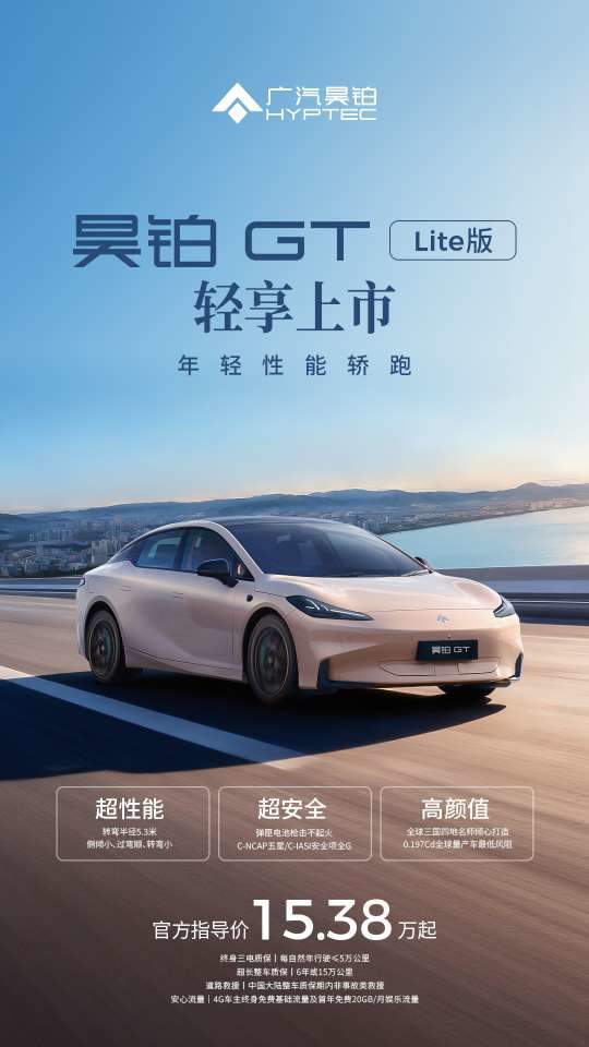 凤凰网科技讯 10月30日,广汽昊铂品牌今日正式推出了旗下昊铂GT车系的全新入门级车型――昊铂GT Lite版,此举被视为对当前中大型纯电轿跑市场的一次精准切入。新车型根据续航能力分为两个版本,CLTC 560公里续航版官方指导价为15.38万元,而CLTC 630公里续航版的指导价为15.88万元。